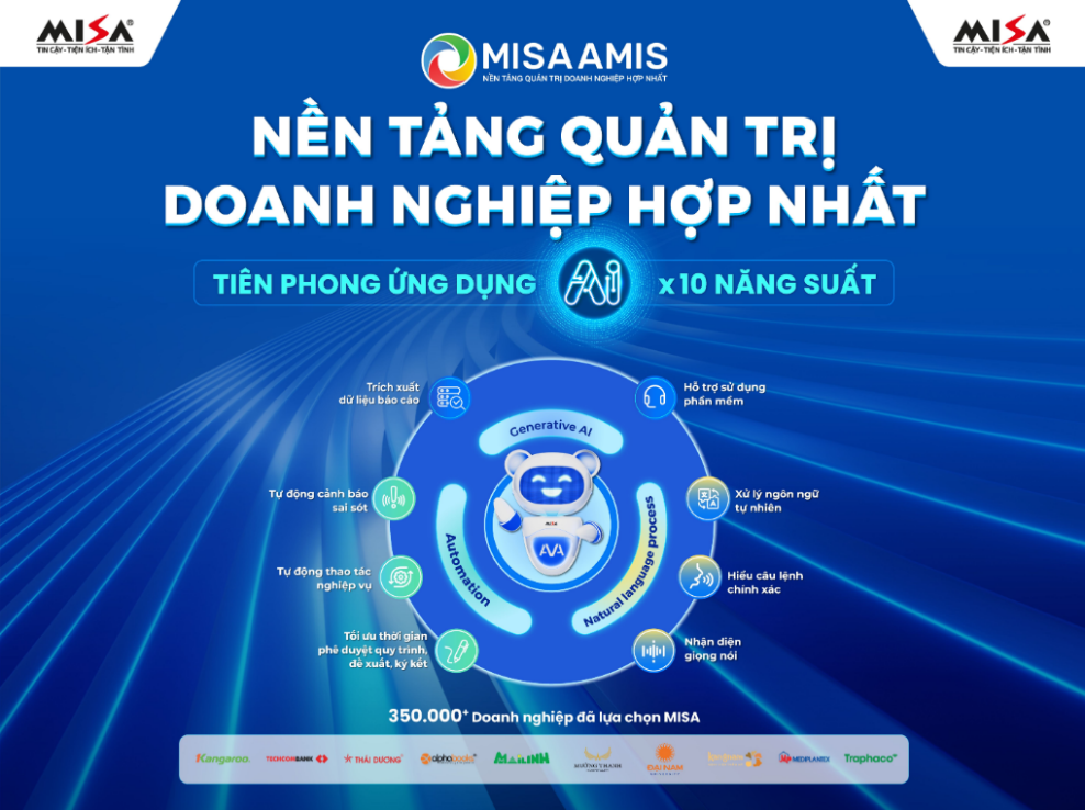 - MISA AMIS: Nền tảng quản trị doanh nghiệp tích hợp đa ứng dụng, từ kế toán, bán hàng đến nhân sự và điều hành. Đặc biệt, với Trợ lý ảo AI MISA AVA giúp tối ưu kế toán, tài chính, bán hàng và chăm sóc khách hàng theo thời gian thực. AMIS OneAI: Tự động hóa, phân tích dữ liệu thông minh, hỗ trợ ra quyết định nhanh chóng.