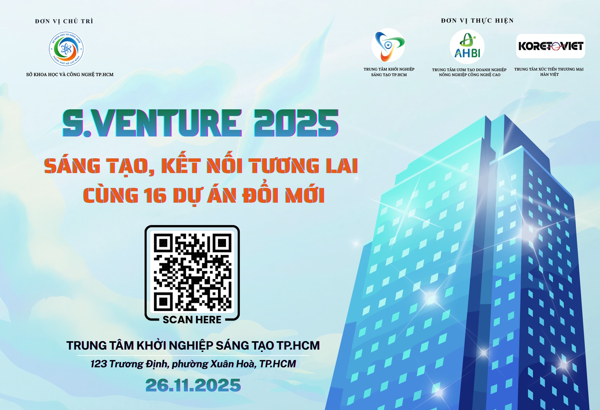 Ngày 26/11/2025, Trung tâm Khởi nghiệp sáng tạo TP.HCM (SIHUB) sẽ phối hợp cùng Trung tâm Ươm tạo Doanh nghiệp Nông nghiệp Công nghệ cao (AHBI) và Trung tâm Xúc tiến Thương mại Hàn - Việt (KORETOVIET) tổ chức chương trình “S.VENTURE 2025 - Sự kiện kết nối startup và nhà đầu tư”.